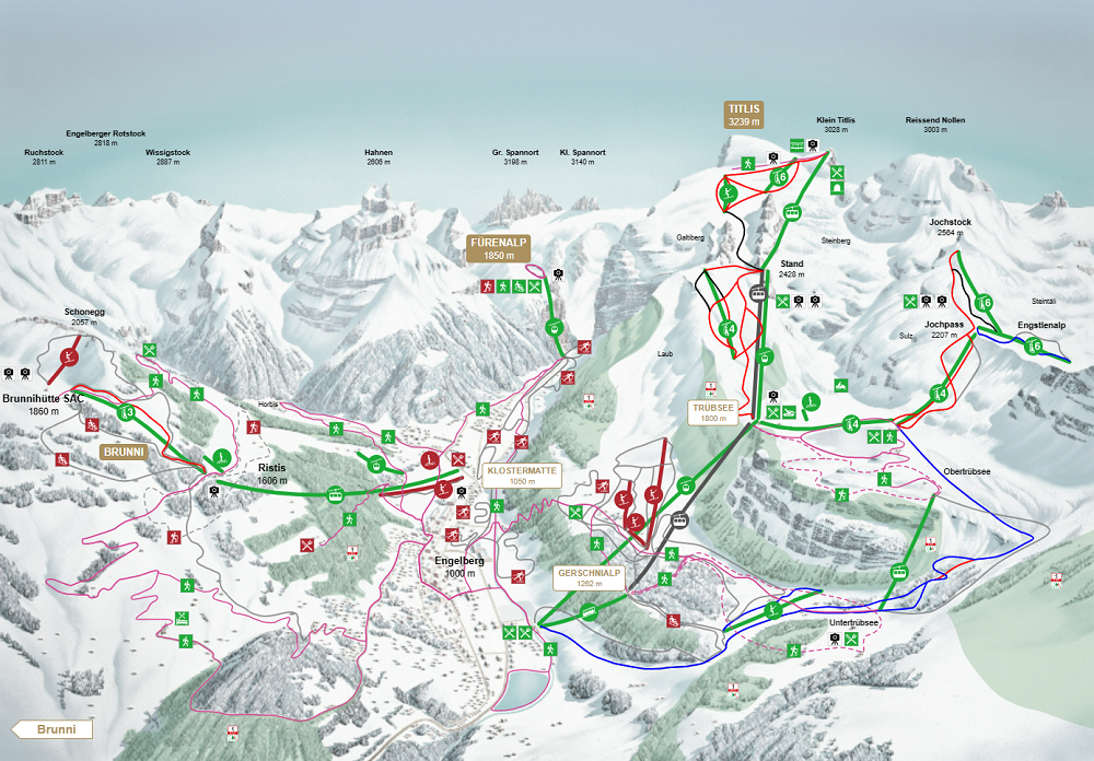 Autofahrt nach Engelberg. Besichtigen der verschiedenen Einstiegsmöglichkeiten der Bergbahnen und des Campingplatzes Eienwäldli mit dem Auto. Bergfahrt mit der Titlis Xpress 8er Godelbahn via Trübsee nach Stand. Weiterfahrt mit der Titlis RotAir Luftseilbahn zum Klein Titlis.