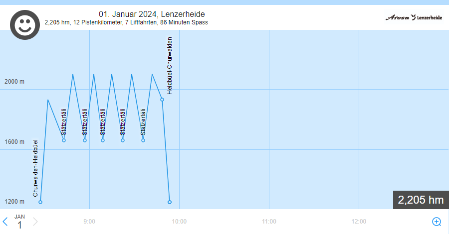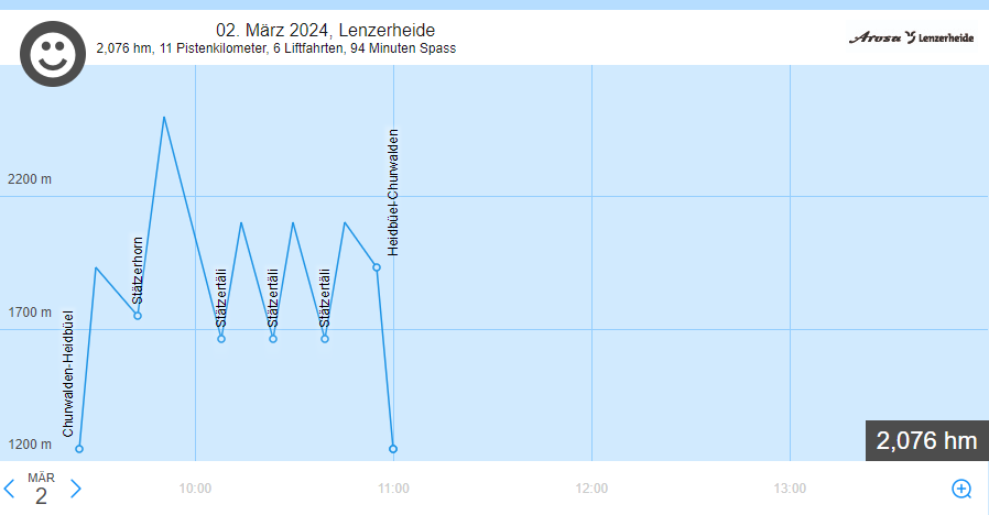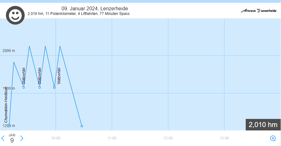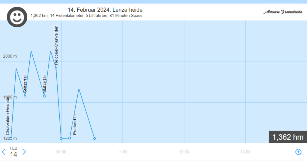 Die Temperatur auf der Anzeigetafel Churwalden zeigte beim Einstieg -3 °C und bei der Rückkehr +8 °C an. Am frühen Morgen waren fast keine Personen auf der Piste, aber da nun Schulferienzeit ist von einigen Kantonen, änderte sich das schnell.