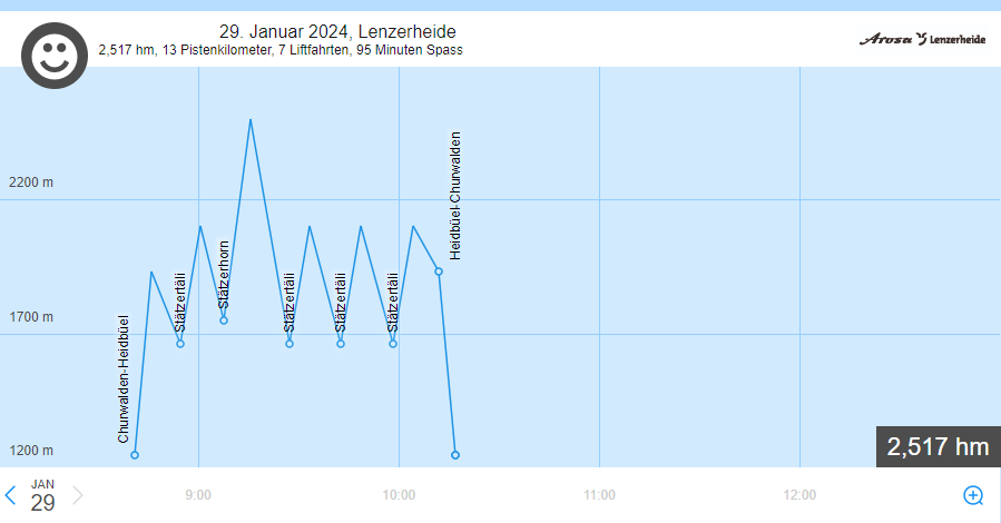 Heute nahmen wir als Einstieg die Panoramabahn Heidbüel und fuhren noch vier weitere Male mit der 4er-Sesselbahn Stätzertäli. Für die Rückfahrt nach Churwalden benutzen wird die Pisten 70b, 70c und 79 via Talstation Skilift Proschieri.