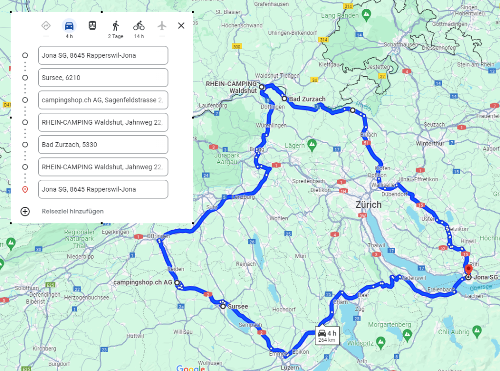 Wir fuhren zuerst via Hirzel nach Sursee, um die von Erwin bestellte Airline-Zurrschiene und Fittiche abzuholen, bei der Firma Zurrfix. Unser Tagesziel war anschliessend der Rhein-Camping in Waldshut-Tiengen. Da unsere Reise über Dagmersellen führte, machten wir noch eine Besichtigung im campingshop.ch. Dieser Campingzubehör Shop ist sehr gross und hat sehr viele Artikel ausgestellt und an Lager.