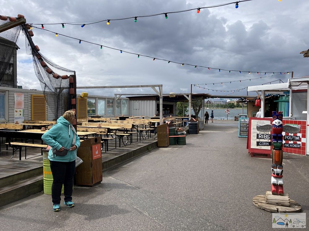 Am Nachmittag war es dann trocken und so fuhren wir mit den Bike’s zu den Street Foods Hallen. Hier gab es so viele leckere Sachen, wir hatten echt die Qual der Wahl. Schlussendlich entschlossen wir uns für Indisch und Griechisch. Danach suchten wir noch den Nespresso-Shop, da wir fast keine Espresso-Kapseln mehr hatten. Der Preis war fast identisch wie in der Schweiz. Dies hätte Anita nicht gedacht, denn sie dachte sie seien teurer. Schlussendlich fuhren wir zum Lofti, sassen noch etwas draussen und schauten aufs Wasser. Da kamen wir dann mit unseren Nachbarn ins Gespräch, die aus Münster waren. Es war ein nettes Paar und wir haben uns gut unterhalten.