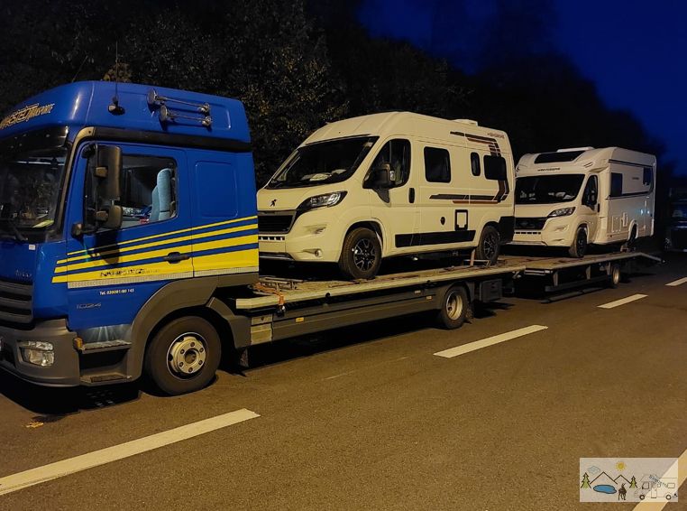 WoMo verladen auf LKW (hinten) und bereit für den Transport nach Jona: